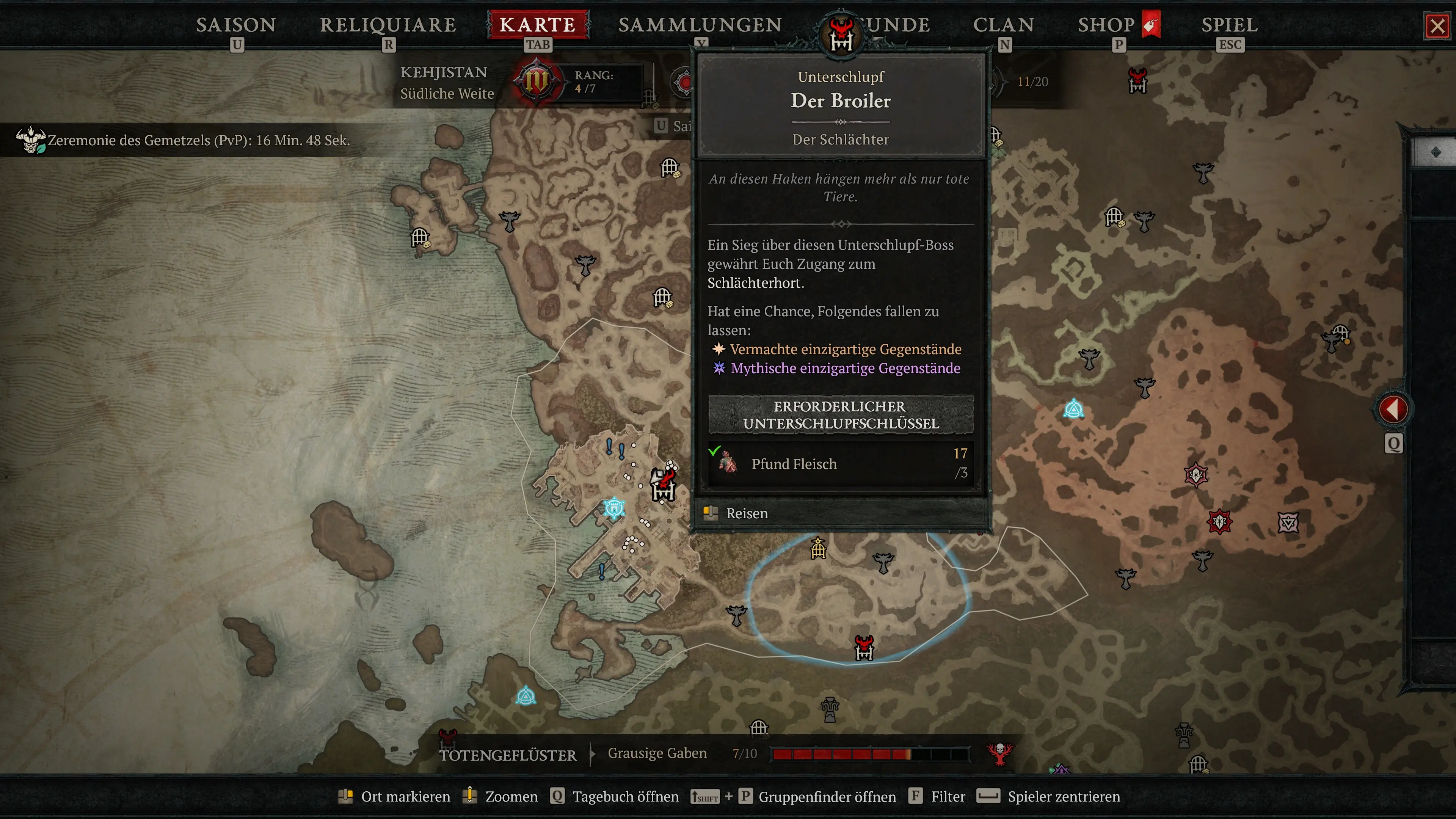 Der Schlächter befindet sich im Broiler, einem Dungeon östlich der Stadt Gea Kul. Der Kampf ist ab Qualstufe 1 verfügbar und kann auch auf allen höheren Qualstufen bestritten werden. Für den Zutritt zum Dungeon und den Bosskampf selbst benötigst du keine Materialien. Um nach dem Sieg die Belohnungstruhe, den Schlächterhort, zu öffnen, brauchst du jedoch 3 Pfund Fleisch.